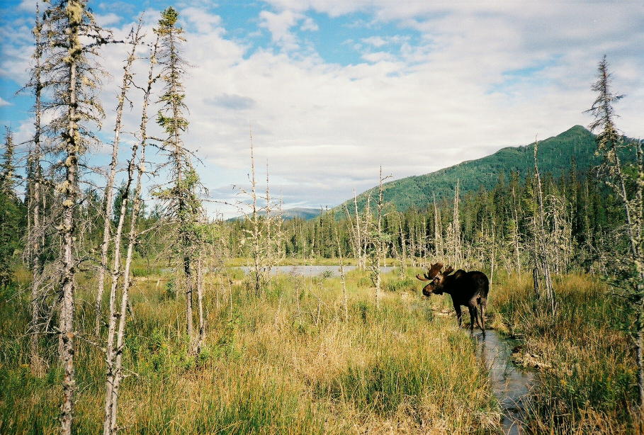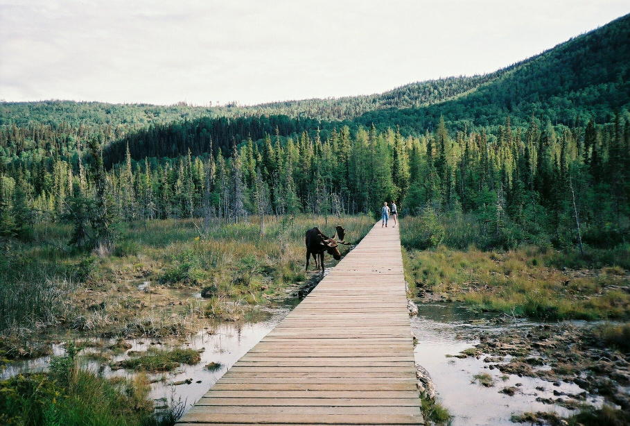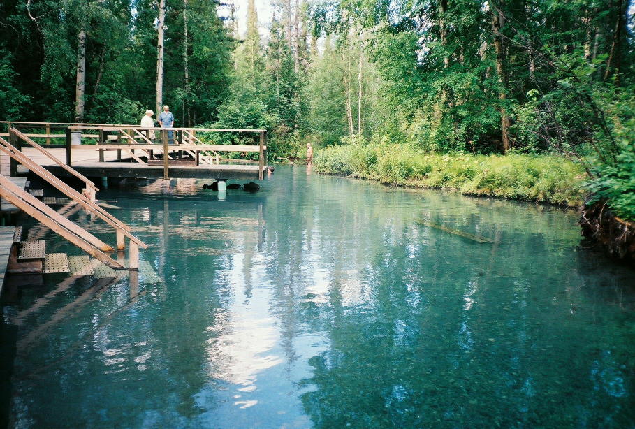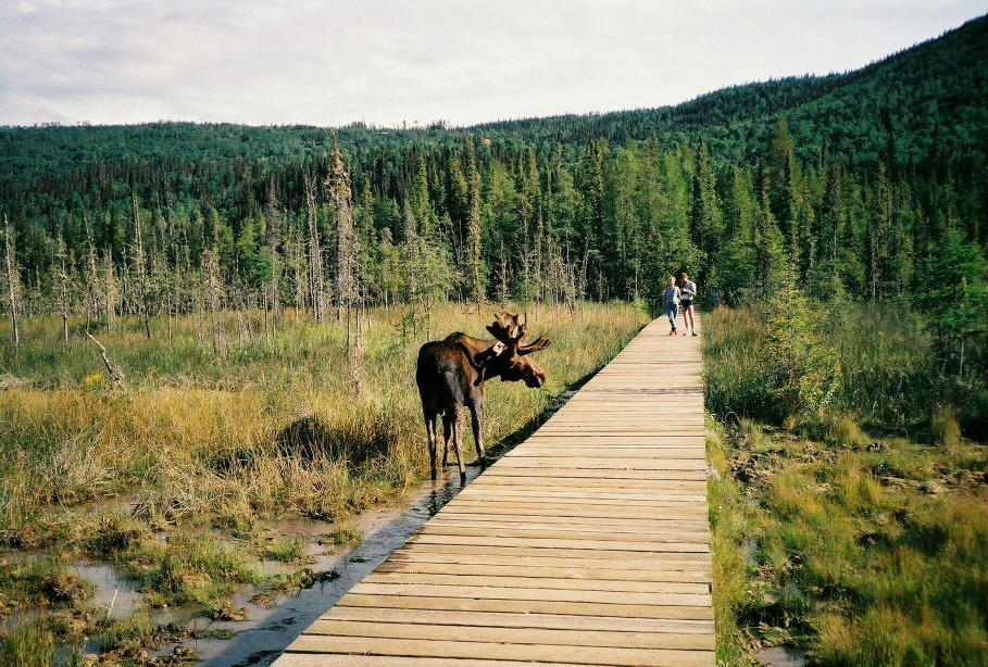 A boardwalk joins the parking lot and the hot springs. I saw a bull moose