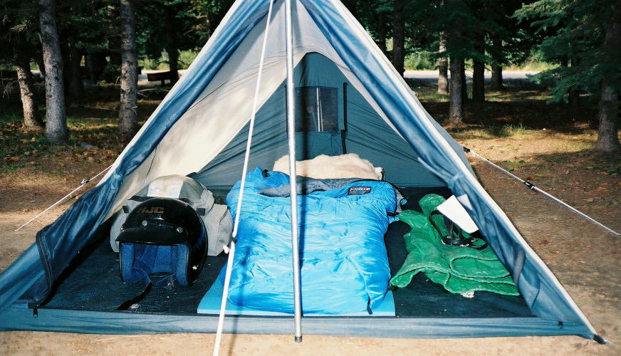 Camping at Healy, AK. The tank bag, helmets, sleeping bag, etc. all fit