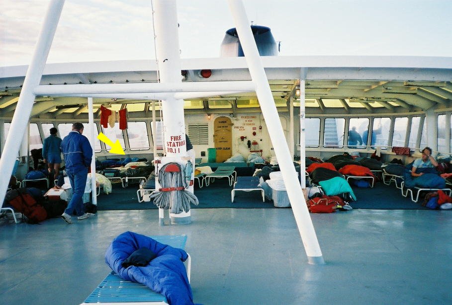 A view of the solarium where I slept. The yellow arrow points to my sleeping