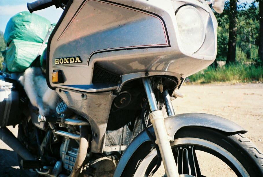 Protective equipment installed on the motorcycle - plastic headlight cover for flying rocks and screen mesh radiator cover for insects.