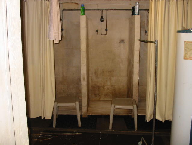 The showers are located in a side room in the basement.