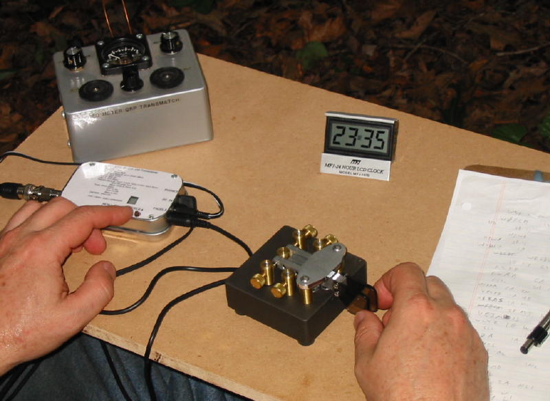 My left hand is operating the radio. This is a complete transmitter and receiver (transceiver) capable of six-band operation. The transmitter produces several watts of output power and the receiver is a very sensitive superhet with a crystal IF filter. It's all packed in a metal enclosure the size of an Altoids tin.