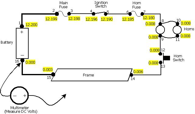 You may be wondering why some items have a voltage drop across them and others don't. Basically, if there is no current flowing through an item with finite resisitance then there will be no voltage drop across it (Ohm's law.) Recall that this is a simplified wiring diagram and circuits unrelated to the horn are not shown. The nonzero voltage drops are due to currents associated with the other circuits (not shown) that just happen to be flowing through shared components (main fuse, ignition switch, etc.)