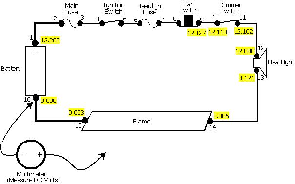 The voltage across the headlight is 12.088- 0.121 = 11.967 Volts. Unless the bulb is burned out, it should be glowing brightly.