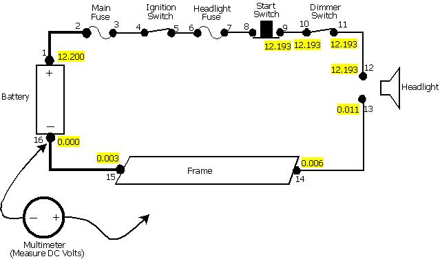 Measuring the voltage at every point in a circuit and then sitting down to analyze the situation is both inefficient and not necessary. A "divide and conquer" approach could lead to a diagnosis much faster. An initial measurement could be taken at some place near the middle, say point 5. The results would be the basis for where to take the next measurement. In this example, point 5 has 12.190 Volts so it would not make sense to measure point 3 next. On the other hand, point 9 would be a good candidate.